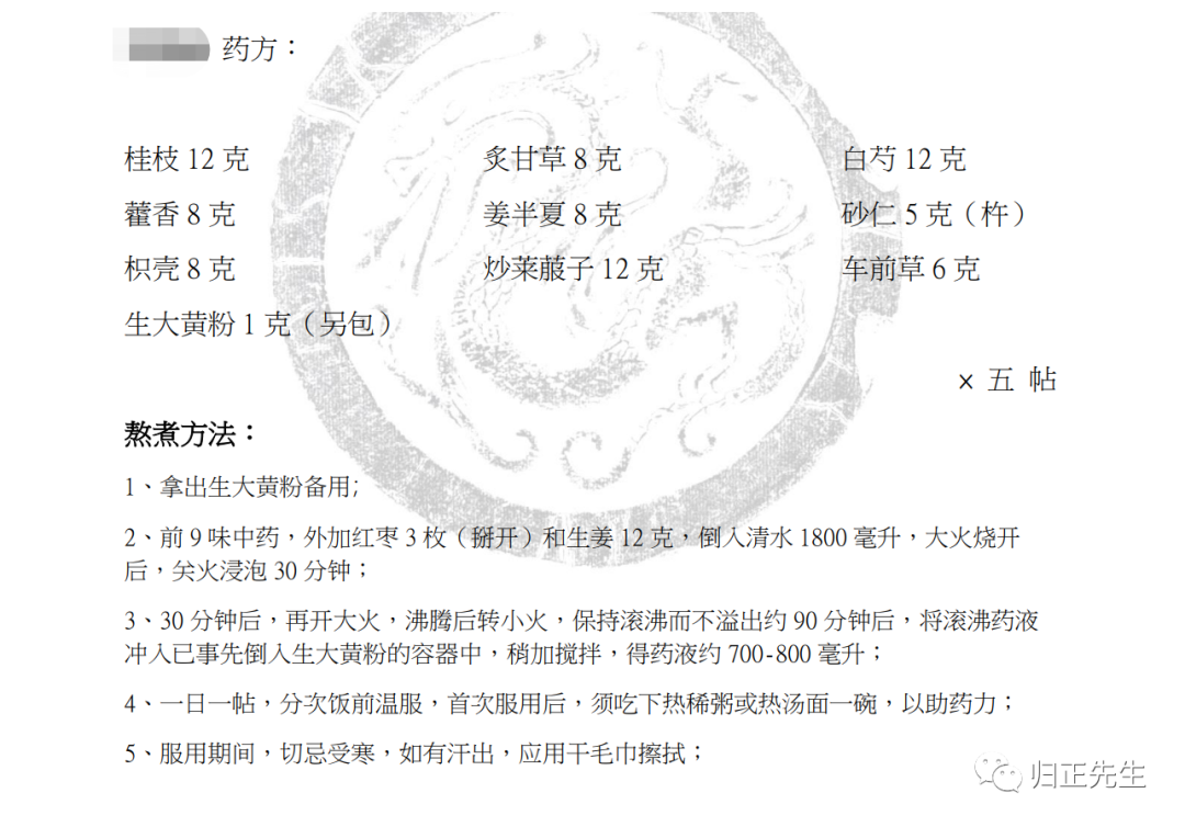 病虽在胃肠,但究其源头,乃是三个月前的风寒未解所致,宜当以温热之剂宣其太阳,清其水谷,其病必解。乃拟下方五剂: